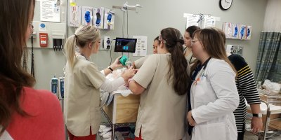 The Otterbein challenge involved how to affordably simulate a busy day in an OB/Maternity environment and ensure that all the learners participated and engaged in a meaningful way. Instructor Chris Zamaripa drew on her recent experience as a nursing educator in a hospital to envision a realistic busy day in Labor & Delivery and the NICU as an exercise for the learners. Assistant Professor Deana Batross joined in as the Standardized Patient "mom" (wearing an "empathy belly") to add realism and a few "surprises" that only a real human can produce.